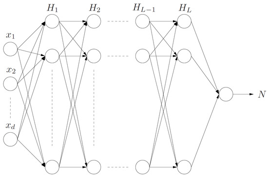 General structure of a multilayer perceptron with input x, L hidden layers and output N. Each neuron evaluates its inputs through predefined activation functions.