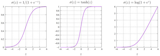 where , , and are the weights and biases of the hidden unit and the output bias, respectively, and H is the overall number of neurons in the hidden layer. Those weights and biases are assembled in the neural network parameter vector p. Here, denotes an activation function of a neuron. The activation functions may be chosen problem-dependent and can have a large impact on the training behavior of the artificial neural network. Figure 2 shows the three activation functions used in the present work, namely the logistic sigmoid, the hyperbolic tangent and the softplus function. Despite its popularity in machine learning tasks, we are not using the rectifier linear unit (ReLu) activation function in the present work. First tests using the ReLu function resulted in poor convergence rates. We suspect that this stems from errors in the numerical integration when using the ReLu function and its discontinuous derivative. The derivatives of the SLP net with respect to its input then appear as