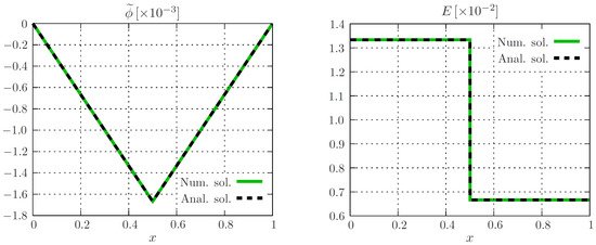 The maximum of this objective function can be found by means of the gradient descent method. The gradients of the objective with respect to the weights p that are needed for such an iterative solver can be computed using Equation (15). We then have everything at hand to carry out the first numerical example. As for the ANN architecture, we use an SLP with neurons in the hidden layer. As for the activation function, the logistic sigmoid function is chosen, and the weights and biases p are randomly initalized with a uniform distribution between 0 and 1. Figure 3 shows the result of the numerical experiment (green) compared to the analytical results (black). One can see that the numerical scalar electric potential is close to the analytical solution. However, having a look at the gradients in the form of E reveals the occurrence of oscillations around the discontinuity. The MATLAB [34] code that generates these results can be found in Appendix A. Note that the tolerances for the step size and the optimality as well as the maximum number of function evaluations and iterations is set different from the MATLAB [34] default values to obtain reasonable results. One might decrease the oscillations by having even higher iteration numbers. However, the jump in the solution at the vicinity of the material jump cannot be captured by the global smooth neural network function. The more neurons we use, the better accuracy we obtain, which leads to a trade-off between accuracy and speed.