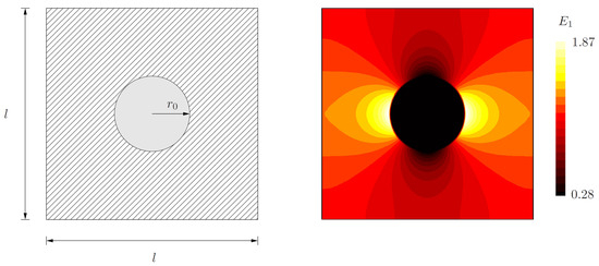 Microstructure of length l with a circular inclusion having the radius . On the right, a finite element solution for a phase contrast of 10 and a loading of and is displayed.