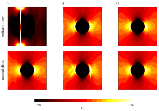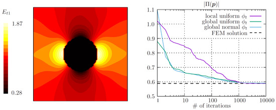 Figure 9 shows the result for after 10,000 iterations for the local construction of the trial function. Compared with the previous simulations using only one global trial function, the fields have fewer oscillations. Additionally, the maximum energy after 10,000 iterations is , being lower than in the previous simulations and lower than the maximum energy computed with finite elements. Interestingly, in the first iterations, the learning rates are higher for the global schemes, whether the weights are initialized according to a normal distribution or a uniform distribution (see Figure 9).