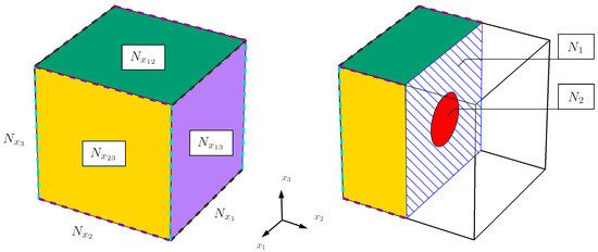 In the present example, we apply the method to a three-dimensional cubic RVE of unit length with a spherical inclusion of radius . We first construct a global trial function, for which we need a set of seven neural networks: acting in the -direction, acting in the -direction, acting in the -direction, acting in the -plane, acting in the -plane, acting in the -plane and acting in the RVE’s volume (see Figure 10). The trial function for the matrix then appears as
