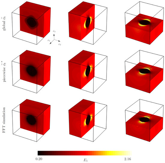 Figure 11 shows the contour plot of for the approach using the global and the piecewise-defined trial function after 20,000 iterations. In comparison to the FFT-based solution, both simulations produce qualitatively good results. The global approximation scheme captures the expected jump of across the phase interface a little less distinctly compared with the piecewise-defined one. However, the piecewise-defined approximation is more difficult to construct and will be quite challenging to implement in the case of complicated microstructure geometries. Quantitatively, the optimized global potentials after 20,000 iterations are quite close to each other, with for the global approach and for the piecewise-defined approach, compared to a optimum energy obtained by the FFT-based simulation.