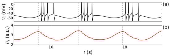 To quantify phase synchronization in the bursting regime, we associated a geometric phase to the sequence of bursts for each neuron. Figure 1b shows the auxiliary variable computed using Equation (11), where each maximum of corresponds to the beginning of a burst of the ith neuron []. If is the beginning time of the kth burst of the ith neuron, the duration of the burst would be , with and , consequently the phase would vary from to , and it is defined for specific time t as []