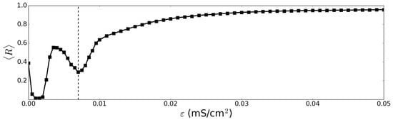 To show the synchronization behavior of the network, Figure 2 depicts as a function of the coupling parameter of a neural network given by Equations (1)–(17). To avoid any trend in the result, we used random initial conditions in the following intervals: ; . Observe that, for (mS/cm2), the network followed a route of globally stable phase synchronized state, since approached 1 as the coupling strength was increased. For the interval of coupling strength , the network exhibited a local maximum of phase synchronization (). This behavior was also observed in small-world network [,,], which characterized a non-monotonic evolution of the synchronization level as a function of the coupling that could be understood as an abnormal synchronization since PS occurred for a coupling . In this way, it is known that several brain disorders, such as Parkinson’s disease and autism, are related to abnormal neuronal synchronization [,,,], thus it is expected that the application of synchronization suppression methods may be useful to vanish the anomalous synchronization, as observed in Figure 2.