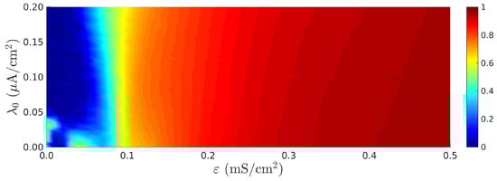 Figure 4 depicts as a function of the coupling for different values of amplitude . For amplitudes lower than (µA/cm2), the network still presented PS for small values of . However, for , the anomalous PS was suppressed without altering the globally stable state of synchronization for coupling value higher than the critical value (which remains constant in for ). The frequency was fixed at 140 Hz (which means s), since experimental results show that only a high frequency currents ( Hz [,,]) could restore normal neural behavior in Parkinson’s Disease (PD) [].