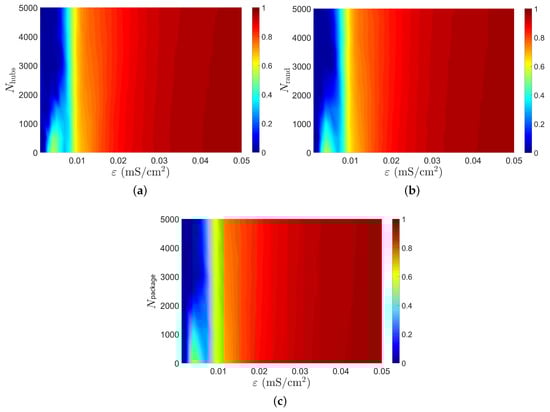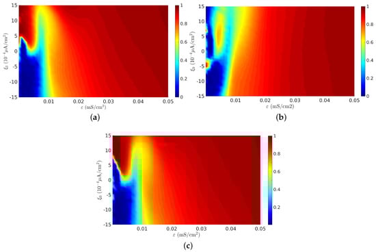 In this approach, , () characterizes an inhibitory (excitatory) current which decreases (increases) the membrane potential . The natural period of the Hodgkin–Huxley-type neuron with the parameters in Table 1 is ms. In Figure 8, we show how the PS varies with the application of in all the neurons as a function of the amplitude and the coupling parameter for three different delay time , in panel Figure 8a, , that is, the mean field affects the network instantaneously; when , the network is characterized by a monotonic evolution of the synchronization the anomalous PS is suppressed; when , the anomalous regime still occurs; and, particularly, when the synchronization for coupling is amplified with . In Figure 8b, , which is , and the mean field with delay is in anti-phase with the , for the anomalous PS is suppressed, otherwise the network still depicts a non-monotonic evolution of the which characterizes abnormal synchronization. In Figure 8c, , as expected; the result is similar to Figure 8a because of the oscillatory behavior of the mean field, that is , the numerical value of is the same in both cases.