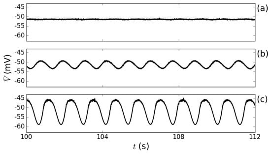 Figure 7 depicts the for three different values of coupling . In Figure 7a, , the mean field display a small amplitude variation since the network presents an unsynchronized behavior. In Figure 7b, and, in Figure 7c, , the mean field display an oscillatory behavior, since in this regime the neurons of the network presents a signal of partial synchronization.