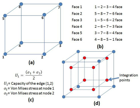 - V represents the nodes obtained from the finite element model of the biostructure. As shown in Figure 2a, for a hexahedral element in a finite element model, nodes are 1, 2, …, 8.