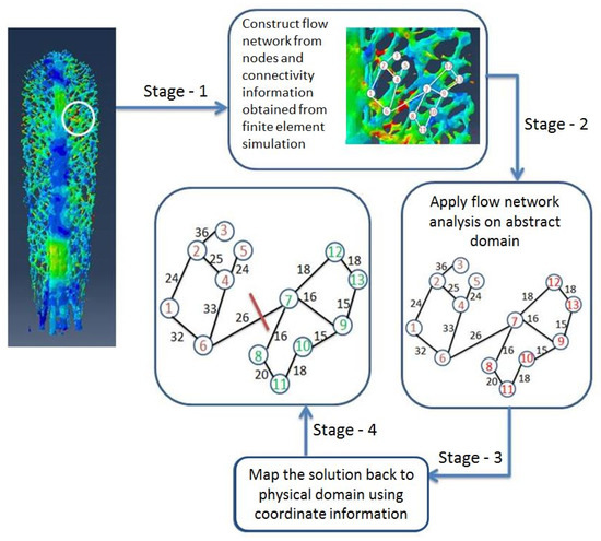 The procedure outlined above for the proposed flow network approach is outlined in the flowchart shown in Figure 4. As shown in Figure 4, the flow network is constructed using the nodes and connectivity information from the computational mechanics experiment. Capacity C of the flow network was obtained from the Von Mises stresses produced from the binary output database files of the computational-mechanics experiment. The mathematical algorithm was executed on the abstract domain. The solution obtained from the mathematical algorithm was mapped back to the physical domain using the coordinate information of the nodes. Paraview was used for visualizing the solution of the mathematical algorithm. As mentioned above, the procedure of formulating the solution from finite element analysis as a flow network graph was carried out in four stages. As shown in Figure 4, in Stage 1, the flow network was constructed using the nodes and connectivity information from finite element analysis. In Stage 2, the weight of the flow network was obtained using the parameter of interest (stresses, in the current study, were also acquired from finite element analysis). In Stage 3, the flow network graph was created. In Stage 4, the flow network graph was provided as input to the mathematical algorithm that computes the minimum cut of the flow network graph. The details of the procedure involved in the four stages mentioned above is described in the previous work of Patel et al. [40].