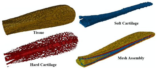 Nano-indentation experiments carried out on the rostrum revealed the material properties of the components of the rostrum [48]. The three parts of the rostrum, as shown in Figure 11, have considerably different material properties [49]. Taking this into consideration, a similar variation in material properties was maintained when selecting the materials for finite element analysis. Table 1 shows the three commercially available materials selected to represent the rostrum components shown in Figure 11.