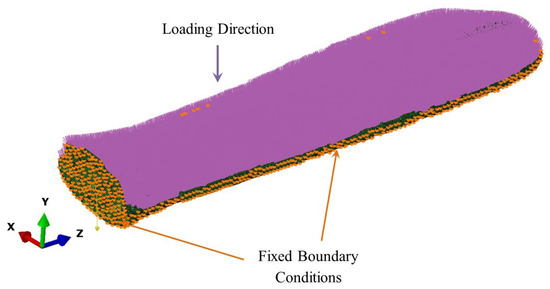 A uniform pressure was applied on the top surface of the rostrum, displayed in purple shading in Figure 12. A fixed-plate boundary condition was implemented on the rostrum by restraining the three components of displacement. A uniform pressure of 50 MPa was applied in the loading direction, shown in Figure 12. Pressure was applied perpendicular to each element face on the top surface of the rostrum, displayed in purple shading in Figure 12, thereby following the surface contour.
