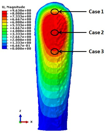 Displacement contours of the rostrum subjected to uniform pressure loading with a fixed plate boundary condition showing the location of source/sink. Cases 1 and 3 were chosen at the edges, and Case 2 in the center of the maximum displacement contour. Dorsal view of rostrum.
