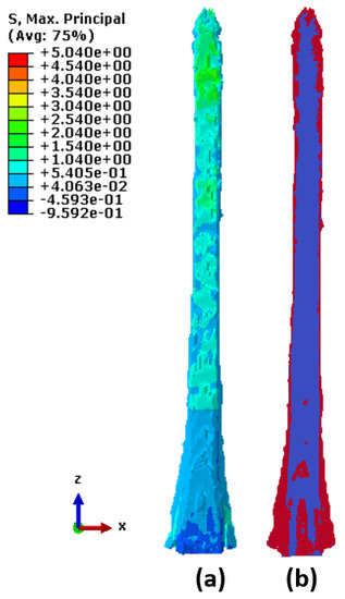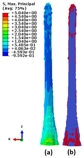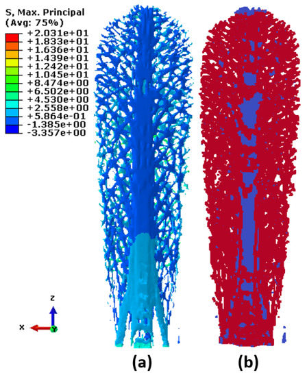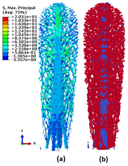 Figure 17a displays the maximum principal stresses on the top surface of the hard-cartilage part of the rostrum. Although finite element analysis gives the overall distribution of stresses in the structural system, the underlying details that govern the phenomena of failure mechanism are hard to determine from the stresses. Figure 17b, on the contrary, shows the minimum cut obtained by executing the maximum-flow/minimum-cut algorithm. The central part of Figure 17b clearly highlights the crushing/buckling behavior that is typically seen in compressive failure. A major part of the failure sites in this case were also located in the region where there was a change in geometry and material properties, which is a typical region where failure initiates. Again, the current methodology successfully identified the sites of failure at the nascent stages of loading.