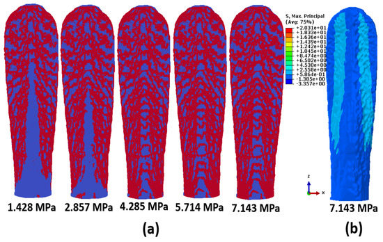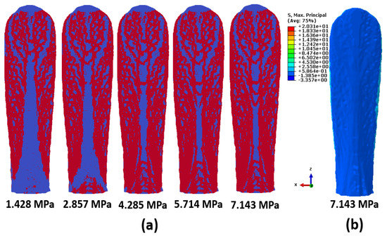 Figure 18a shows the minimum cut obtained from flow network analysis on the bottom surface of the rostrum using the source–sink combination shown Figure 9. As seen in Figure 18a, the flow network captured the failure patterns at much earlier stages of loading that were not evident in the computational-mechanics results shown in Figure 18b. At low pressure levels, the strain localization patterns are captured on the tip of the central region of Figure 18a. As pressure increases, the strain-localization patterns are formed all along the central region of the rostrum tissue. Trusslike patterns are captured on the tissue part of the rostrum, as seen in Figure 18a. In contrast, the maximum principal stresses seen in Figure 18b did not show evidence of such patterns. The strain localization patterns captured through the flow network strategy are typically observed in a structural system under tensile loading. At a pressure of 7.143 MPa, Figure 18a also does not show any failure sites at the base of the tissue part of the rostrum indicative of it being stronger than the remaining part of the rostrum. This is the region that is attached to the mouth of the paddlefish, and this particular structural system is optimized for performance in this area. The flow network strategy captured this pattern at nascent stages, when the material was still in the linearly elastic regime.