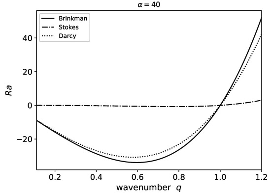 Rayleigh number necessary for zero growth rate as a function of wavenumber q. For a given wavenumber, higher Rayleigh numbers will result in growing perturbations. We compare the results for three hydrodynamic models. In the case of a large gap () results using Brinkman’s equation are close to results using Stokes equation.
