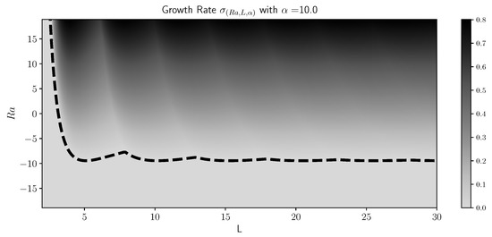 Largest growth rate as a function of Rayleigh number and domain width. The broken line indicates the value of growth rate zero.