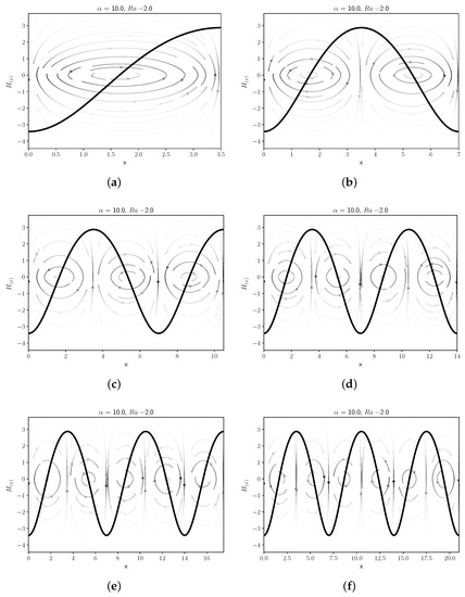 Increasing the domain size beyond the critical value for the flat front instability leads to convective fluid motion. Numerical solutions of the nonlinear equations just above criticality show that small random perturbations to the flat front grow with time. After some time, they form a steady pattern with fluid rising on one side of the domain and falling on the opposite side generating a single convective roll as shown in Figure 6a. The mirrored solution is also a steady solution of the equation, that developes from different initial conditions, and is also stable. The patterns propagate with constant shape and a velocity higher than the velocity for the flat front. This shape also leads to steady front solutions for rectangular domains of larger widths. For example, doubling the domain size we can accomodate two single counterrotating convective rolls as shown in Figure 6b. These solutions have the same speed as the single roll solution, but in this case the fluid rises at the center of the rectangular domain falling on the sides. The resulting shape corresponds to a symmetric front with a maximum near the center of the domain. We can continue this process for larger domains, finding structures formed by placing a one roll solution, next to another counterrotating one roll solution. The first structures formed in this manner are displayed in Figure 6. The solutions with an even number of convective rolls are symmetric with respect to the center of the domain. The mirrored solution is also a solution, for the case of fronts with odd number of rolls. This solution resemble the cellular solutions found in the Kuramoto–Sivashinky equation [20]. We will analyze later the conditions for stabily of the cellular solutions.