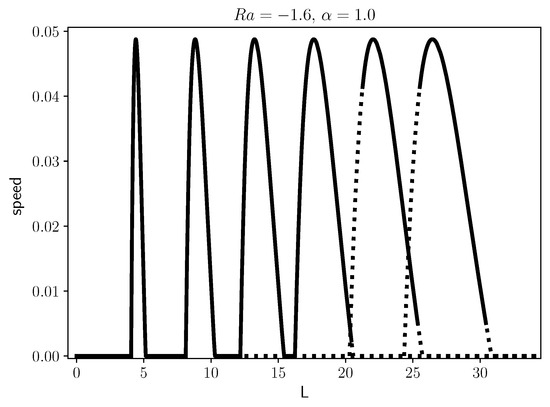 We obtained solutions for different values of the parameters , , and L analyzing their stability, considering the flat front speed . To determine the front stability, we used Python routines to obtain the eigenvalues of the Jacobian matrix derived from Equation (31). The sign of the largest real part of the eigenvalues determines the stability of the steady front, a negative sign will indicate stability. We also study solutions that evolve in time (such as oscillatory or chaotic solutions) using a simple Euler method to evolve Equation (31) with a time step , and 18 term truncation.