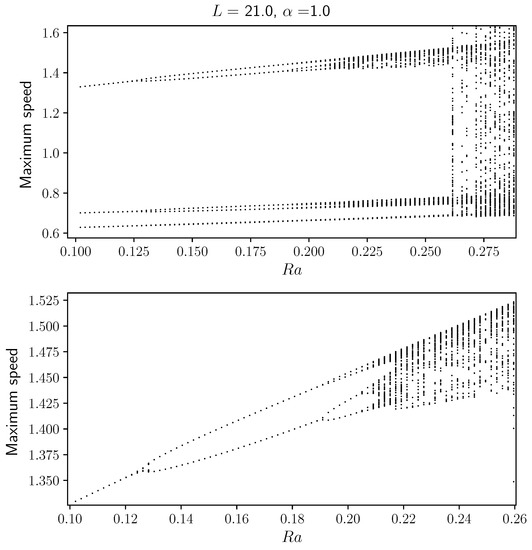 Fronts described by the KS equation exhibit complex spatio-temporal behavior, such as oscillations and chaos. Fluid motion and confinement can help to enhance or surpress this behavior. In Figure 9 we display a bifurcation diagram showing the relative maximum front speed relative to the flat front speed as a function of the Rayleigh number. As the front evolves with time its propagating velocity changes, reaching a maximum before slowing down. Oscillatory fronts will display a few maxima before repeating the sequence again. For values of the Rayleigh number close to , Figure 9 displays three velocity maxima. As the Rayleigh number increases, we observe a sequence of bifurcations to oscillatory states with higher periodicity. This period doubling cascade leading to chaotic states is the result of enhanced fluid motion at higher Rayleigh numbers. Negative Rayleigh numbers inhibit the oscillatory motion resulting in flat front thus surpressing complex fluid motion. Another parameter that has an impact on complex behavior is the parameter , which is inversely proportional to the square of the gap width. Figure 10 shows a similar period doubling cascade displaying the front velocity maxima relative to the flat front speed versus the parameter . We notice that for close to 1.34 there is clearly periodic behavior. Reducing increases the number of maxima, eventually reaching a chaotic state. This implies that confining the substances in a Hele–Shaw cell of small gap (large ) diminish the complex spatio-temporal behavior. This implies that in experiments in a Hele–Shaw cell, the gap width can be an effective control parameter for transitions between different spatio-temporal states.