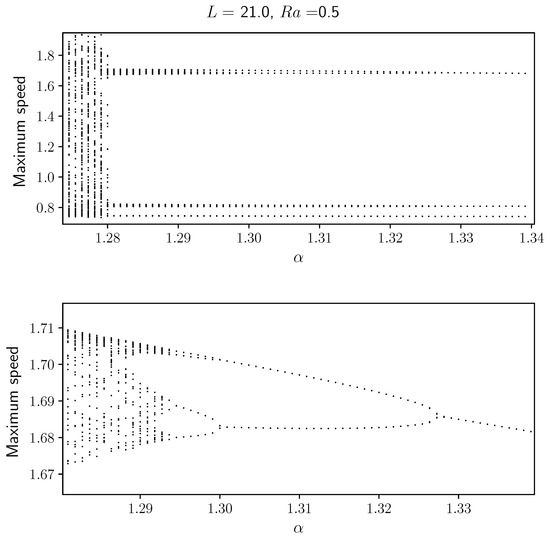 Bifurcation diagrams showing relative maximums for the velocity of the average front position relative to the flat front speed. We observe a period doubling cascade to chaos as the parameter is decreased. This corresponds to reducing the gap between the plates in a Hele–Shaw cell. The bottom panel is a detailed from the top panel.