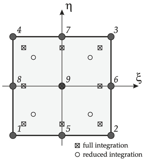 It is well-known that the integrals in definitions (31) and (32) require a tool to be computed numerically. In the current research, the Gauss–Legendre rule is used. According to this approach, the infinitesimal area is evaluated in the master element as follows, through the determinant of the Jacobian matrix: . Consequently, the integral of a generic two-dimensional function can be written as