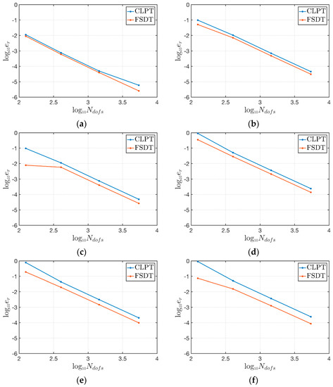 For completeness, the convergence features of the proposed approach are presented in graphical form in Figure 4, where the relative error was computed for increasing values of the degrees of freedom (). The graphs are presented in logarithmic scale. It can be observed that a good convergence was reached for both thin and thick plates.