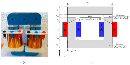 U-cored static electromagnetic device: (a) Experimental test [33], and (b) geometrical parameters (see Table 1 for the various parameters).