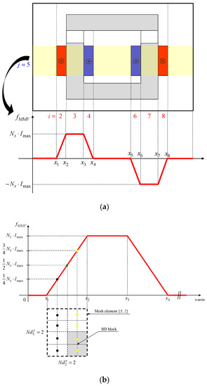 where is the zeros matrix of dimension , is the ones matrix of dimension , and is a MMF function explained in [35]. Figure 4a represents the waveform of this function at corresponding to Imax. The MMF curve for a coil is defined by a trapezoidal waveform whose Ampere-turns change linearly from 0 to Nt · Imax for the forward conductor ⊗ and from Nt · Imax to 0 for the return conductor . Figure 4b describes an example of MMF values according to the discretization number for the mesh element with and . All BD blocks in the y-axis have the same values of MMFs. The MMF values differ with the discretization number according to the MMF slope in the conductor.