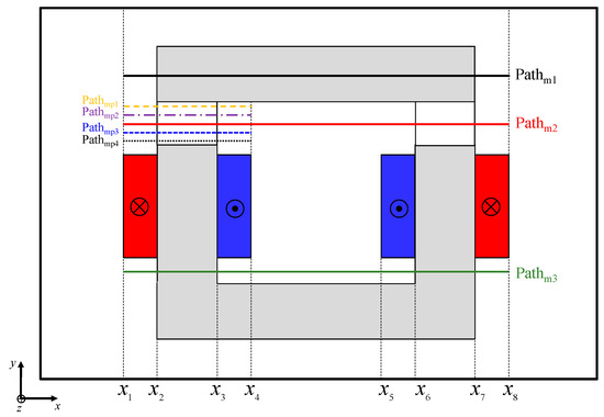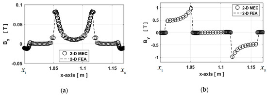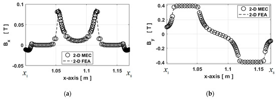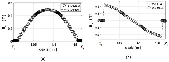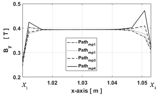The validation paths of for the comparison are given in Figure 6. The waveforms of and are represented on various paths in Figure 7, Figure 8 and Figure 9 for Imax = 7.78A at and . The dotted lines represent the components of calculated by the 2-D FEA and the circles correspond to 2-D generic MEC. It can be seen that a very good agreement is obtained for the components of whatever the paths. Figure 7a and Figure 9b confirm that the electromagnetic device is not saturated with a maximum level of equal to 1 T. In Figure 8a, it is interesting to note that the level of on the edges of massive conductive parts are not the same, which is due to the electromagnetic device structure. Indeed, the magnetic leakages are more important inside than outside. It should be noted that in massive conductive parts is considered negligible in relation to (see Figure 8). Moreover, Figure 10 presents a zoom of in the left massive conductive part for the various paths (viz., Pathmp1 to Pathmp4) between and (see Figure 6). Due to leakage fluxes, the levels of are different at the edges and in the middle of the massive conductive part whatever the path in the y-axis. These various magnetic flux densities will be used as BCs in the 2-D analytical model based on the Maxwell–Fourier method, which calculate the magnetic field distribution considering the skin effect as well as the resultant eddy-current density. It is interesting to note that the path number depends on the discretization number in the y-axis, so the influence of the discretization number will be discussed in Section 3 in the eddy-current loss calculation.