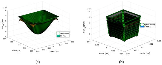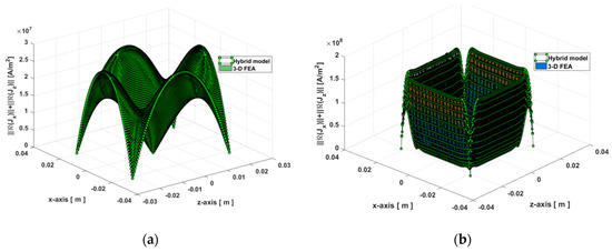 Figure 14 shows the magnetic field distribution considering the skin effect on a 2-D grid parallel to the xz-plane located in the middle of the massive conductive part in the y-axis. The waveforms of have been calculated with Imax = 7.78A at t = 0 s and hmp = 6 mm for two values of electrical frequency (viz., 50 Hz and 1600 Hz). Also for the same conditions, the evolution of the resultant eddy-current density is given in Figure 15. There is a very good agreement of the results given by analytic and numeric calculation. The electrical frequency effect on the behavior of and can be clearly seen. In these figures, it can be seen that the skin effect appears slightly at 50 Hz, contrary to 1600 Hz where the massive conductive part act as a barrier to the crossing flux. The error order is less than 16% for (viz., 12% at 50 Hz and 16% at 1600 Hz) and less than 4% for J (viz., 1% at 50 Hz and 4% for 1600 Hz).