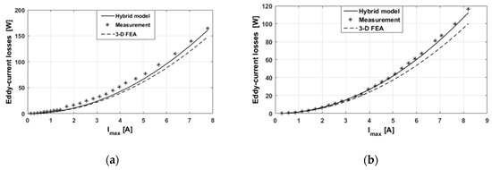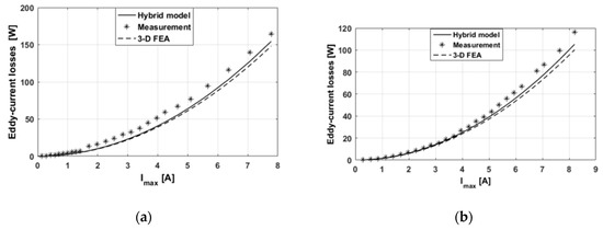 Validation of eddy-current losses (analytical, numerical, and experimental) in massive conductive parts versus with for: (a) and (b) .