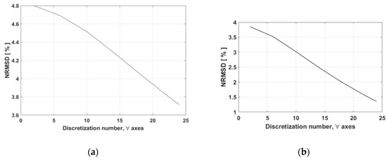 NRMSD according to the discretization number in both axes (i.e., x- and y-axis) for: (a) and (b) .