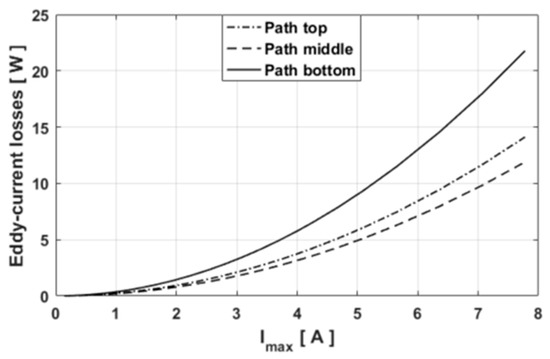 The eddy-current losses were calculated on different layers in the y-axis of massive conductive parts. Figure 19 shows the evolution of at the top, middle, and bottom of the massive conductive part for hmp = 6 mm with a discretization . It is interesting to note that the eddy-current losses present a non-uniform distribution depending on the height of the massive conductive part. This can lead to a non-uniform temperature distribution on the massive part. According to the magnetic field distribution in the y-axis (see Figure 10), the level of eddy-current losses is higher at the bottom of the massive conductive part. This is due to the magnetic flux density which presents a high level compared to the medium layer.
