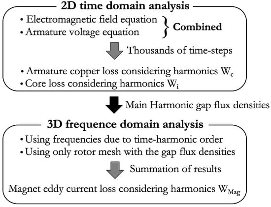 FEA was used to study the eddy-currents due to slotting effect in PMSMs [9] and loss calculation in both magnetic and non-magnetic sleeves [97]. Eddy-current losses were investigated on a tubular PM motor by using FEA [11]. Often, magnets are divided to decrease the eddy-current losses. However, the 3D FEA calculation of eddy-current in PM with slits is more difficult, and the computer resources (computation time) increase. The method with double nodes at slits was used to overcome this problem and increase the accuracy of calculation [98,99]. The side-insulation between adjacent PMs causes a discontinuity of the eddy-current distribution. This case was modeled by 2D FEA for surface-mounted PMSM [100]. PM eddy-current loss calculation by considering the end-effect and by using 3D FEA takes vast amounts of time. Yamazaki et al. [101] proposed a method where firstly a 2D nonlinear time-domain analysis was applied with the PWM voltage waveform. Next, the 3D frequency domain analysis was used for each remarkable harmonic. The total PM eddy-current losses were calculated by summing the results of the two steps, as shown in Figure 1.
