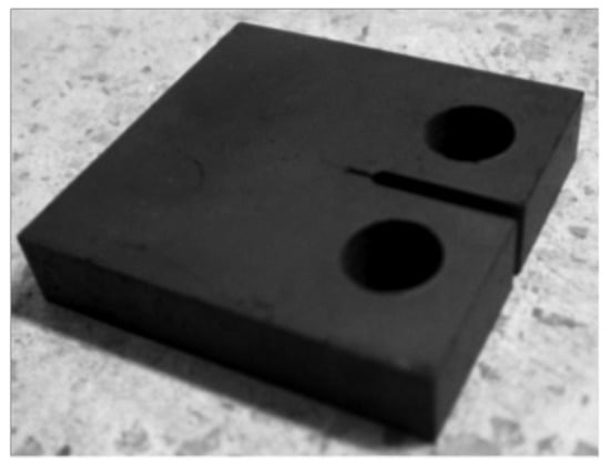 Even though the FWHM here is based on the interpolation of the computational results, the experimental data within the framework of fracture mechanics also showed similarly due to the modeling that mimics the experiment. Therefore, the data obtained and used in the computational approach here simulated an ideal engineering experiment. Experimental data were not taken solely for this purpose; instead, it was for another purpose [,]. However, the data were then processed to relate and as it is described in Equation (16). The samples used were compact tension specimens. While the detailed data collection method is beyond the topic of this paper, and the readers are to consult to the reference directly [], for the sake of the reader’s convenience, the method is briefly highlighted here. Figure 6 is the representative specimen used in the experiment. The stress intensity factor K for standard CT specimen geometry was calculated as follows: [,]: