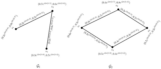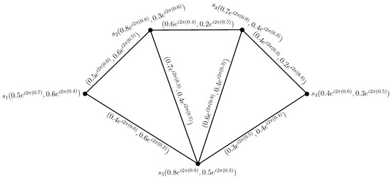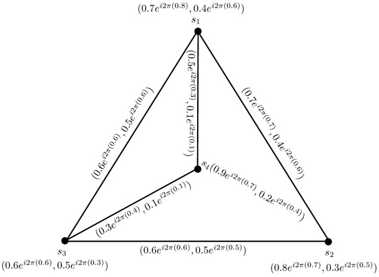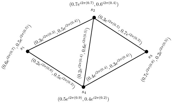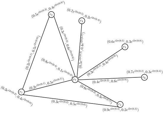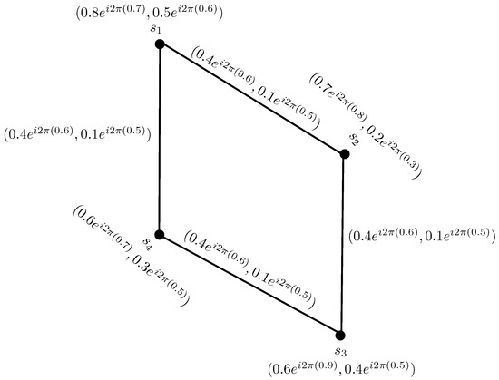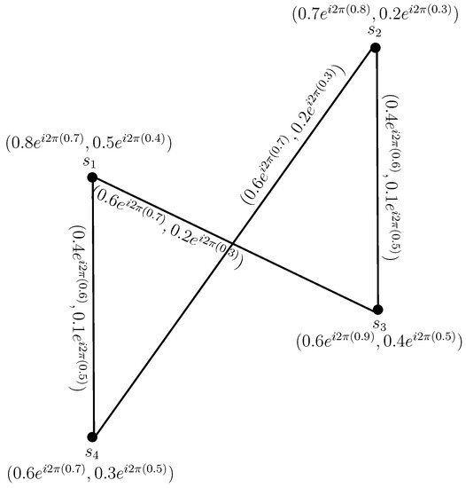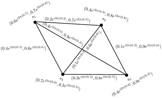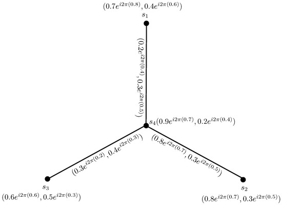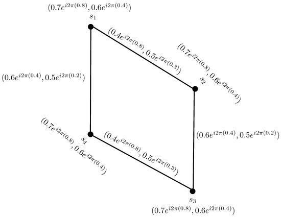 To compare the CPFGs with PFGs, we convert the vertex set and the edge set of CPFG in Figure 1, from complex Pythagorean fuzzy numbers to the Pythagorean fuzzy numbers by considering the phase terms of each complex Pythagorean fuzzy value as zero, as shown in Figure 2.