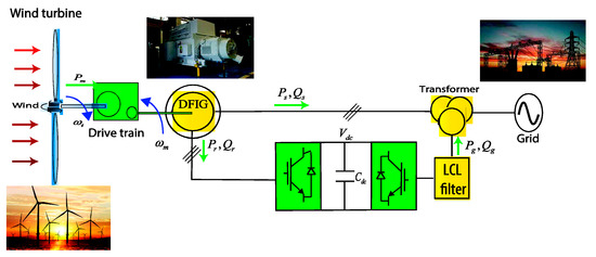 The configuration of the DFIG-based WECS is depicted in Figure 1. A WT is joined to the DFIG by means of a gearbox. The DFIG is an induction machine, which the stator windings are directly connected to the grid, while the rotor windings are connected to the grid thanks to a back-to-back converter.