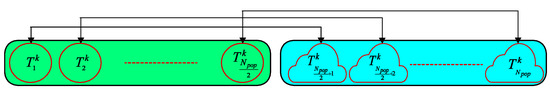 In a d-dimensional search space and at the iteration time, each object of the population is described by its temperature , . In order to enhance the optimization performances, the TEO algorithm uses a Thermal Memory (TM) to store a number of historically best vectors as well as their related fitness. Therefore, these stored solution vectors are added to the population and the same numbers of current worst objects are deleted. After that, a growing order of solutions is retained according to their cost function values. The sorted objects are equally divided into two groups of environment and cooling objects as shown in Figure 5. The environment objects are denoted as while the cooling ones are .