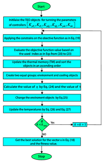 Flowchart of the proposed Thermal Exchange Optimization (TEO)-tuned PI controllers’ parameters.