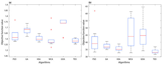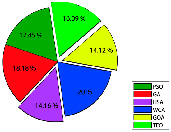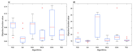 All reported algorithms are independently run 10 times. The termination criterion is set as a maximum number of iteration reached for a population size of the thermal agents equal to . All the values of the used common parameters are kept equal. All algorithms have been executed on a PC computer with Core TM i5-7200U CPU and 2.5 GHz/8.00 GB RAM. The specific control parameters of the reported algorithms are listed in Table 2.