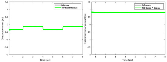 As shown in Equation (9), the stator active and reactive powers are independent from each other. In addition, the components of stator power are linearly varying with the direct and quadrature rotor currents. This powers’ regulation is thus performed using PI controllers for the d and q axis components of the rotor currents.