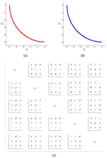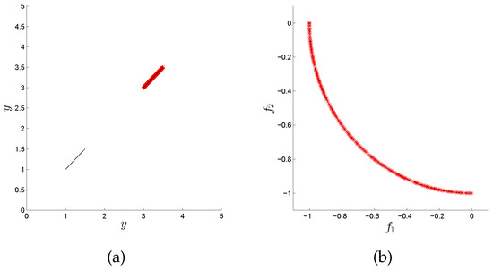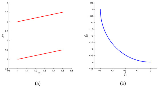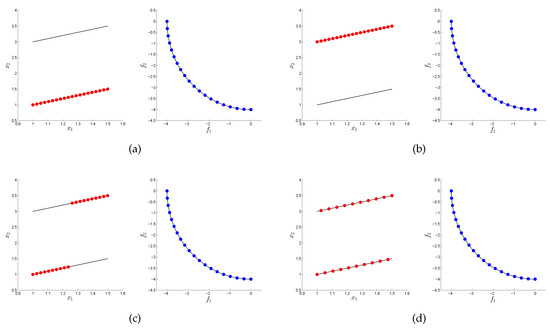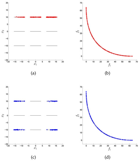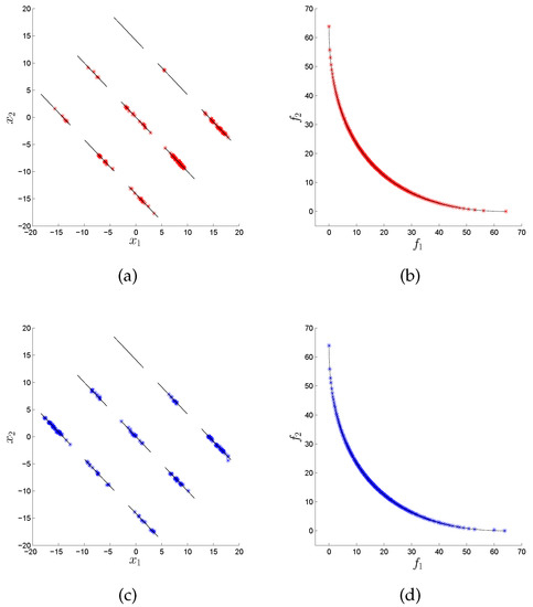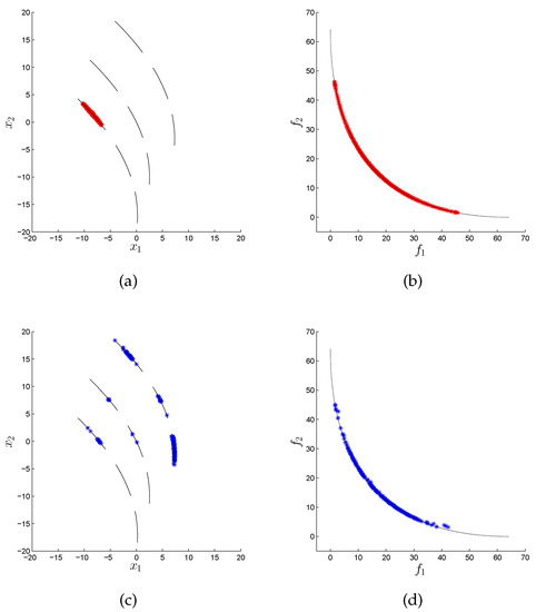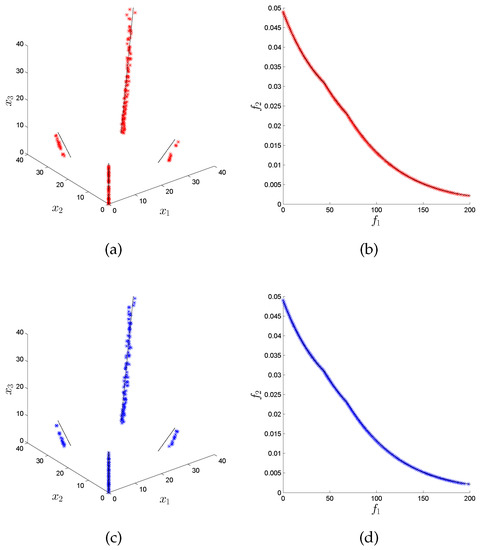 In many areas such as Economy, Finance, or Industry, the problem arises naturally that several conflicting objectives have to be optimized concurrently [1,2]. Such problems are called multi-objective optimization problems (MOPs) in literature [3,4,5]. The solution set of an MOP (in decision space) is called the Pareto set and its image (defined in objective space) the Pareto front. One important characteristic of continuous MOPs is that their Pareto sets and fronts typically form ()-dimensional objects, where k is the number of objectives considered in the problem. In many applications, the Pareto front is of primary interest as it contains information about the desired qualities of each selected solution. As a consequence, almost all existing MOEAs focus on approximations in objective space while entirely neglecting the distribution of the individuals in decision space. There exist, however, also applications where the values of the solutions in decision variable space are of great importance. As an example, consider that the amount of a certain resource (i.e., the value of a variable ) used to obtain the desired quality (measured in objective space) is important. For two solutions that are equal or similar in objective space, one may prefer the one that has a lower value of . Another example is that the variable could represent the launch date of a project, as, e.g., in [6] in the context of space mission design. For such problems, different values of directly relate to different timescales in the realization of the project. In that case, the decision maker may select one “optimal” realization of the project, and keep solutions with similar objective values but later launch dates as back-up solutions. For such problems, the sole consideration of the approximation quality in objective space represents a potential shortcoming. On the one hand, it is of course possible to formulate all such problems via additional constraints and objectives. On the other hand, such re-modellations of the problem lead in general to a higher complexity compared to the original problem. For instance, by each added objective, the dimension of the Pareto set/front increases by one. Hence, in this context, there exists an additional challenge in solving a given MOP, since we have to find a suitable approximation to the optimal set both in objective and decision space, in order to provide a satisfying overview of the possible solutions to the decision maker. Another application can be found in [7], where data analysis techniques are used to discover patterns and rules. Here, authors conclude that such process of innovation by optimization (“innovization”) has an enormous potential to revolutionize the engineering of the design process in the industry.