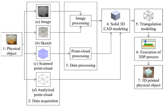 When a given object is reverse engineered, a data acquisition process is required, as shown by Step 2. In most cases, data acquisition is based on image processing, sketch processing, scanned point cloud processing, or analytical point cloud processing. In the case of image processing, the image data of a given object are extracted. Afterward, the data are processed by an appropriate computational method (Step 3) for making the information meaningful to a CAD package for solid modeling. In the case of sketch processing, a given object is sketched and then the sketch data are processed by an appropriate computational method for making the information meaningful to a CAD package for solid modeling. In the case of scanned point-cloud processing, a given object is scanned by a 3D scanner and then represented by a relatively large set of points known as a point cloud. Afterward, the point cloud is processed by an appropriate computational method for making the information meaningful to a CAD package for solid modeling. Thus, the abovementioned data acquisition processes require either image processing or point cloud processing. The computational complexity and the respective solutions have been studied by numerous authors, as reported in []. For the sake of better understanding, the following articles can be noted that show the computational details regarding raster to vector graphics conversion [,,], sketch processing [,,], data registration [,,,], noise removal [,], data reduction [,], curve-based surface reconstruction [,,,,,,,], polygon-based surface reconstruction [,,,,], and direct slicing [,,,,].