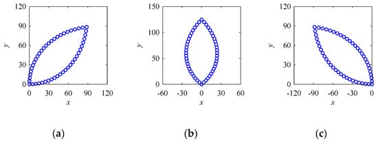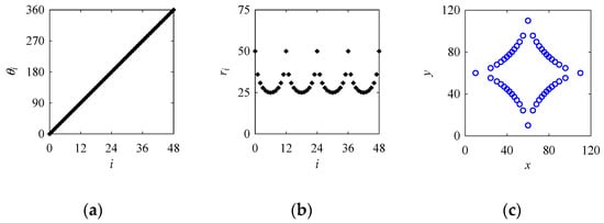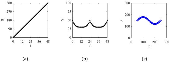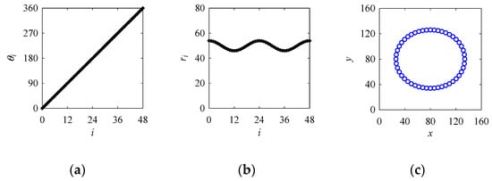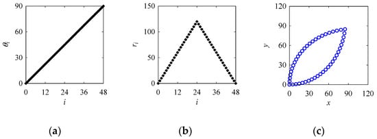 In Equation (A1), θi = 2πi/n. While creating a point cloud for a circle using Equation (A1), the parameters are set as follows: a = 100; n = 48; and i = 0, 1, ..., 48. The point cloud shown in Figure 11a presenting the circle is created using the abovementioned formulation.