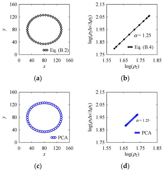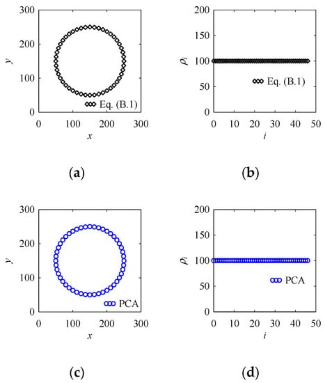 Figure 11 shows two point clouds of the same shape, circle. Figure 11a shows the point cloud of the circle modeled by Equation (A1), where the radius, a = 100 and center, Pc = (150,150). In this case, 49 points are created to model the circle. Figure 11b shows the values of ρi, which is equal to 100.21. Theoretically, ρi must be equal to a = 100. This small error (100.21 – 100 = 0.21) is due to calculation precision error. On the other hand, Figure 11c shows the point cloud of the same circle modeled by a PCA-generated point cloud. For this point cloud, ri = 100 (= d); φ = 0; θi = 2πi/n; n = 48; i = 0, 1, …, 48; and Pc = (150, 150). In this case as well, 49 points are created to model the circle. Figure 11d shows the values of ρi, which is equal to 100.21. This means that for a circle, ri plays the role of the radius of curvature of a circle.