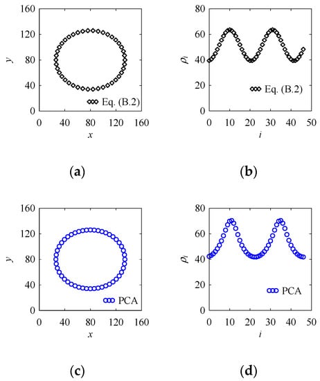 Figure 12 shows two point clouds of the same shape, ellipse. Figure 12a shows the point cloud of the ellipse modeled by Equation (A2), where the major radius, a = 54; minor radius, b = 46; and center, Pc = (80, 80). In this case, 49 points are created to model the ellipse. Figure 12b shows the variation of ρi. On the other hand, Figure 12c shows the point cloud of the same ellipse modeled by a PCA-generated point cloud. For this point cloud, d = 15; φ = 0; ri is decreased linearly from 54 to 46 and increased linearly from 46 to 56 for two cycles; θi = 2πi/n; n = 48; i = 0, 1, …, 48; and Pc = (80, 80). In this case as well, 49 points are created to model the ellipse. Figure 12d shows the variation of ρi. As seen in Figure 12a,c, it is clear that both point clouds are identical and their radius of curvature (Figure 12b,d) also varies in the same trend. This means that for an ellipse, ri plays the role of the radius of curvature of an ellipse.