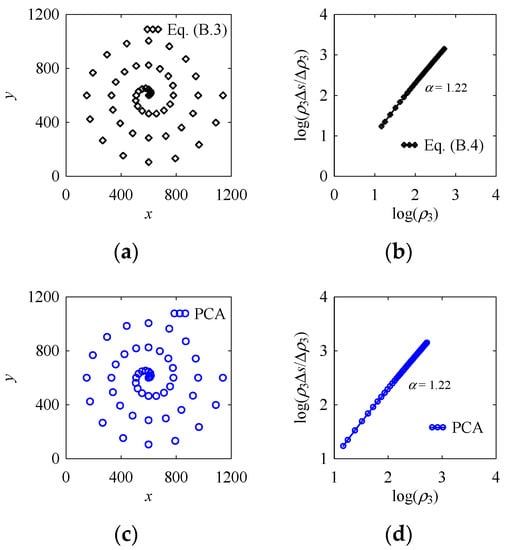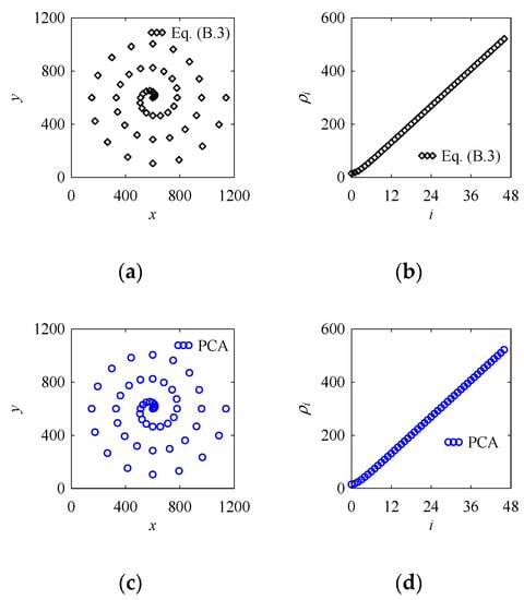Figure 13 shows two point clouds of the same shape, spiral. Figure 13a shows the point cloud of the spiral modeled by Equation (A3), where an arbitrary, positive, real constant, a = 28.647 that controls the distance between the successive turnings of the spiral. In this case, 49 points are created to model the spiral. Figure 13b shows the variation of ρi. On the other hand, Figure 13c shows the point cloud of the same spiral modeled by a PCA-generated point cloud. For this point cloud, d = 15; φ = 0; ri = 0, 11.25, …, 540; θi = 2πi/n; n = 48; i = 0,1, …, 48; and Pc = (600, 600). In this case as well, 49 points are created to model the spiral. Figure 13d shows the variation of ρi. As seen in Figure 13a,c, it is clear that both point clouds are identical and their radius of curvature (Figure 13b,d) also varies in the same trend. This means that for spiral, ri plays the role of a radius of curvature of a spiral.