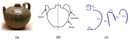 An Ewer from Seto ware. (a) A photograph of the Ewer []; (b) an illustration of the ewer; (c) individual point clouds.