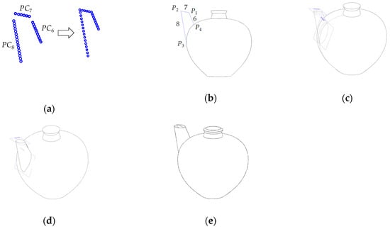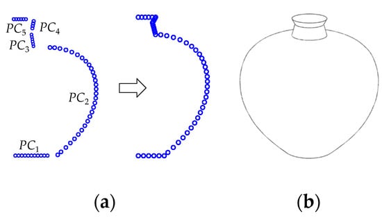 Figure 16a shows an ewer from Seto ware (Seto is a city located in Aichi Prefecture, Japan) produced during the Nanboku-chō period in the 13th century []. The ewer consists of three parts—the body, spout, and handle—as shown in Figure 16b. Few line segments and a concave can represent the body, line segments can represent the spout, and an elliptical shape can represent the handle. Hence, the ewer can be constructed using line segments, a concave curve, and an ellipse. Figure 16c shows the individual point clouds modeled by the PCA. Consider the individual point clouds, PC1, PC3, PC4, PC5, PC6, PC7, and PC8, presenting the line segments that can be modeled by customizing the inputs, θi and ri, as described in Section 2 (Figure 2 and Figure 3). Similarly, consider the point cloud PC9, presenting an elliptical shape that can be modeled by customizing the inputs, θi and ri, as described in Section 2 (Figure 7). Regarding the point cloud PC2, presenting the concave curve that can be modeled by setting the input parameters of the PCA as follows: PC = (90,90); d = 15; φ = 0; θi = πi/2n, n = 30; i = 0,1, …, 30; and ri is linearly decreased from 73.55 to 0.